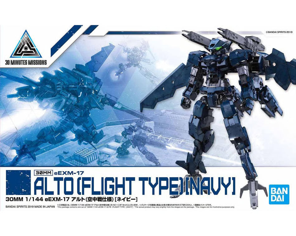The Bandai 1/144 30MM eEXM‑17 Alto Flight Type (Navy) – 2500627 is a sleek aerial variant from the 30 Minutes Missions series, designed for high-altitude combat and skyborne agility. This kit features articulated wings with multiple mounting gimmicks, a navy-colored multi-booster unit, and a flight pack that enhances display versatility.