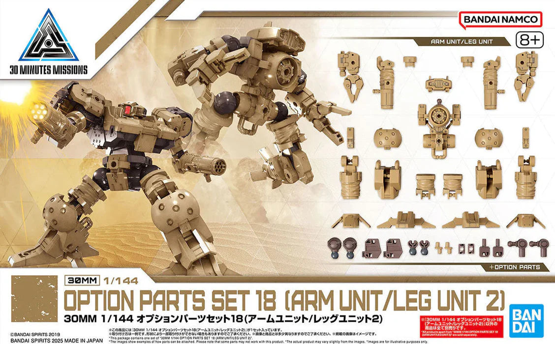 The Bandai 30MM Option Parts Set 18 (Arm Unit / Leg Unit 2) is a 1/144-scale accessory pack designed for the versatile 30 Minutes Missions series. This add-on kit lets builders upgrade their 30MM mechs with customizable arm and leg components that enhance functionality and visual appeal.