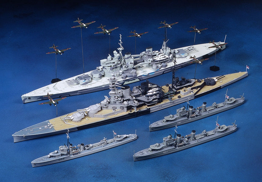 During the fighting in and around Malaya (now Malaysia), the British battleship Prince of Wales was sunk by Japanese bombers in a display of the potential that air power held over big ships. This set includes naval models from the famed Water Line series, plus minute 1/700 scale aircraft.