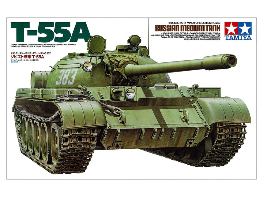★Tamiya presents the 1/35 scale plastic assembly kit of the Russian Medium Tank T-55A. ★The unique form of this tank has been accurately replicated. ★You can choose between several versions, with or without a DShK-M anti-aircraft machinegun, of the T-55 and T-55A. ★You will also be able to represent Polish or Czechoslovakian built versions. ★Every characteristic of the T-55A such as the engine grills and external fuel tanks has been reproduced down to the finest details. ★One tank crew chief figure and decals for 5 different markings are included.