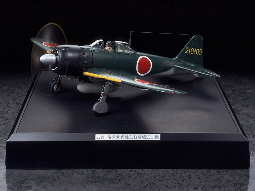 A realistic scale model of the Mitsubishi A6M5 Zero Fighter, that features moving parts and sound. 1/32 scale, fuselage length: 285mm, wingspan: 344mm. Display stand size: 285mmx285mmx40mm. Sound of real Sakae 21 Engine digitally recorded.Control mechanism and speaker box housed in display stand enable replication of start-up process of engine- from initial running to finish. Simultaneous propeller rotation and engagement of lights are also possible. Mini-motor encased in engine powers propeller rotation to synchronize with each phase of engine start-up.LED and optical fiber used to replicate tail, wing and fuselage lights. Model lights up in a total of 9 different places. Unpainted canopy parts come with pre-painted window frame parts.Kit requires four R14/C/UM2 batteries (sold separately).