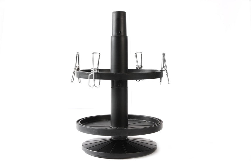 This is a rotating two-tier paint jar stand that lets you organize your paints clearly for easy access. It can store up to 7 jars of acrylic "mini" (10 ml) or 6 jars of 23 ml paints per tray. Each tray has a small groove along its edge, allowing you to also use this as a drying stand simply by using alligator clips (4 included) to hold newly painted parts.