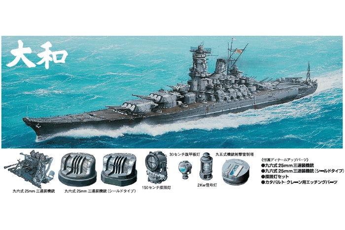This is a 1/700 scale plastic assembly model kit of the Japanese Battleship Yamato which includes highly detailed laser cut parts by Fine Molds. Parts depicted with the set include; Type 96 triple 25mm cannons (shielded type), Type 96 triple 25mm cannons, a search light clear parts set, and photo-etched parts for the crane and catapult. The Yamato will feature an impressive finish once assembled with these highly detailed parts.